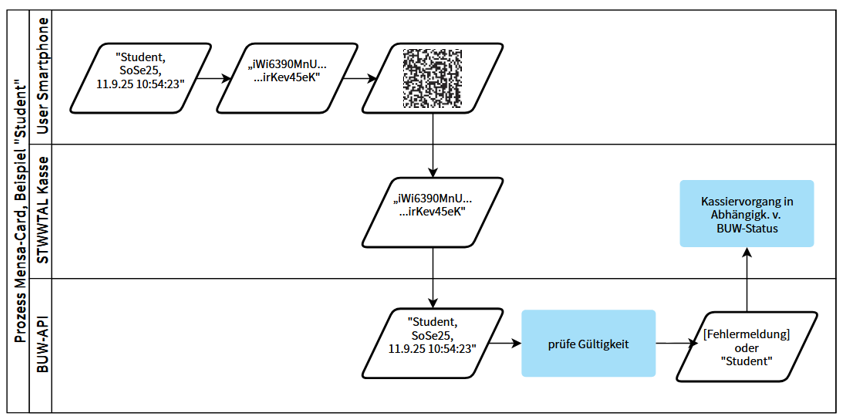 Beim Bezahlvorgang an der kamerabasierten Mensa-Kasse wird der QR-Code eingescannt. Das Kassensystem wandelt den QR-Code in den verschlüsselten Text. Eine Entschlüsselung ist dem Kassensystem nicht möglich. Das Kassensystem sendet den verschlüsselten Text an ein System der BUW, betrieben vom ZIM. Dort wird der empfangene Text entschlüsselt und die Information über die Gültigkeit ausgewertet. Im Erfolgsfall wird der Mitgliedsstatus (Student / Mitarbeiter) und nur dieser zurück an das Kassensystem gesendet, das dort ggf. mit einer unterschiedlichen Bepreisung reagiert.