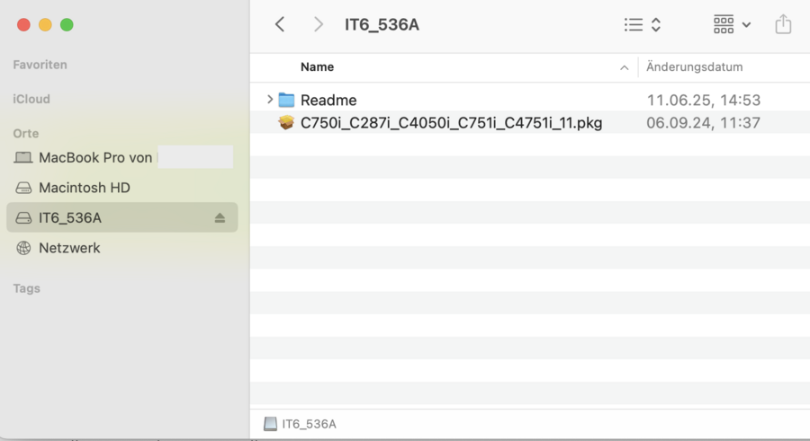 Öffnen Sie die .dmg-Datei. Sie erscheint als Laufwerk unter "Orte" links im Finder, z. B. als IT6_536A. Wechseln Sie in den Container.