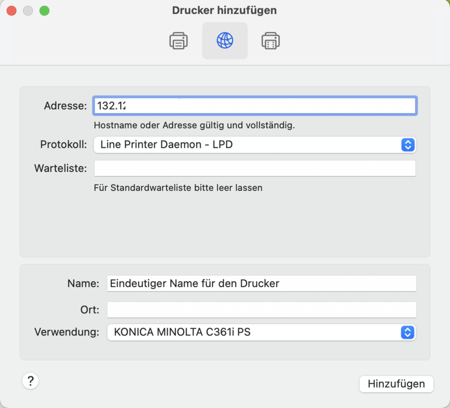 Tragen Sie im Feld "Adresse" die IP-Adresse des Druckers ein (Wo finde ich die IP-Adresse?). Wählen Sie im Dropdown-Menü "Protokoll": Line Printer Daemon – LPD aus.