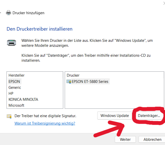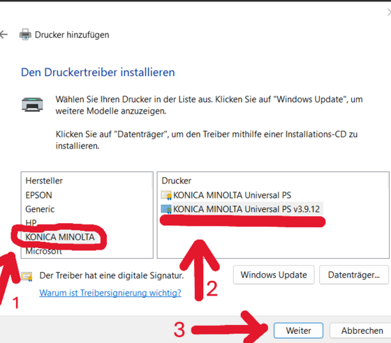 Hersteller und Drucker wählen (mit Zahl am Ende)