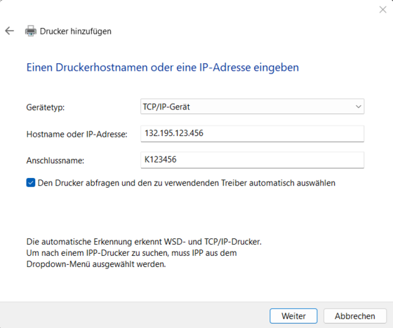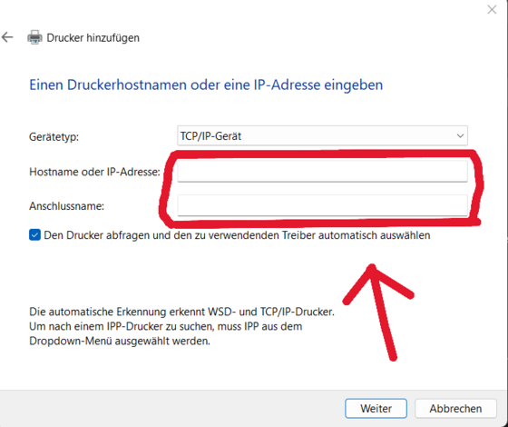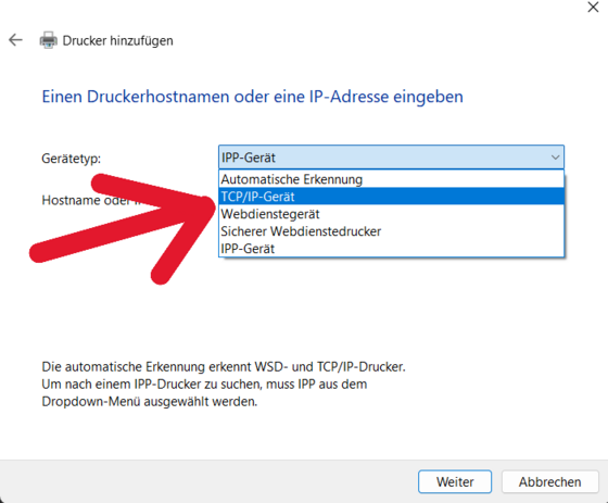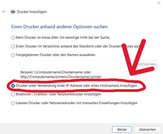 5. Hier wählen Sie „Drucker unter Verwendung einer IP-Adresse oder eines Hostnamens hinzufügen“. Klicken Sie dann auf "Weiter".
