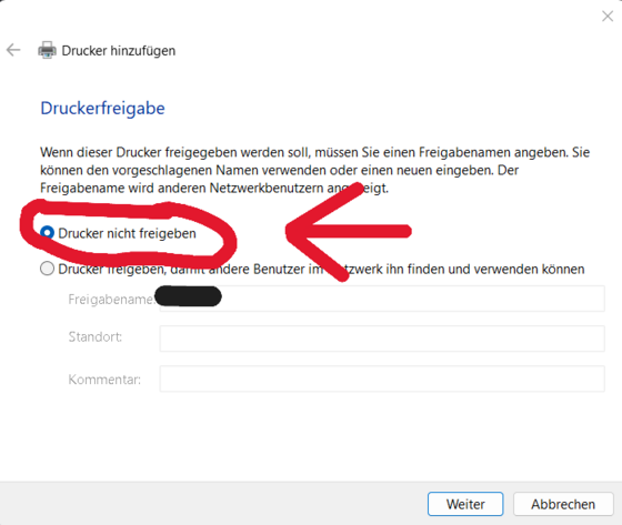 11. Im Punkt "Druckerfreigabe" setzen Sie die Auswahl bei "Drucker nicht freigeben" und klicken auf "Weiter".