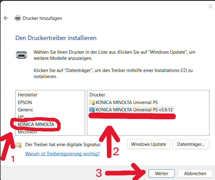 Bild 3: Wählen sie den Hersteller „KONICA MINOLTA“ und wählen den Drucker mit