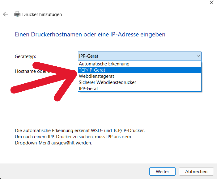8. Sie tippen die IP-Adresse ein die Ihr Drucker hat und der Anschlussname fängt mit