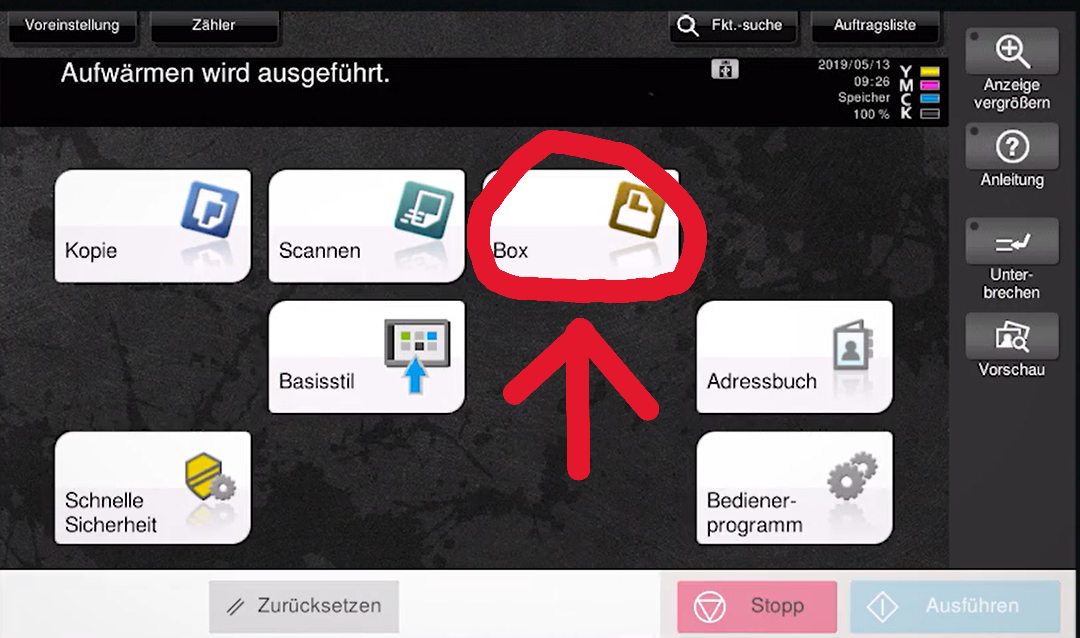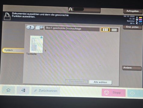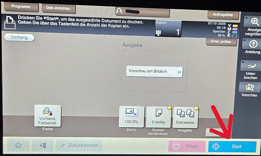 Der Bereitstehende Befehl fürs Drucken ausführen am Kopierer/Drucker.