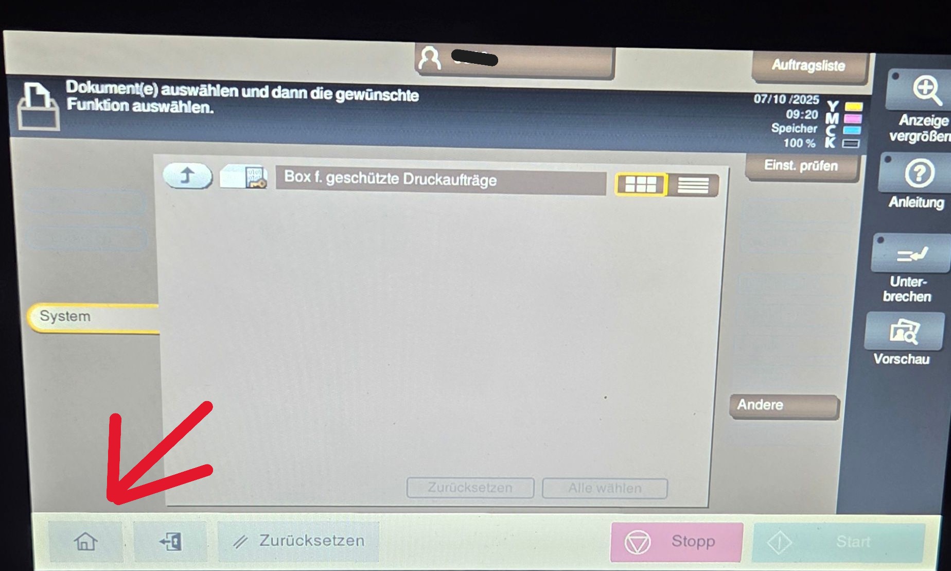 11. Wählen Sie auf der linken Seite „System“ aus und drücken auf „Sicheres Drucken“.