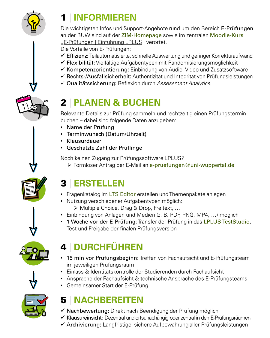 Eine kompakte Übersicht des Ablaufs einer E-Prüfung an der BUW – von den ersten Überlegungen über die Durchführung bis hin zur Auswertung – finden Sie hier. Die häufigsten Fragen (FAQ) rund um E-Prüfungen werden auf den Unterseiten behandelt; diese sind aufgeschlüsselt in die Bereiche "Vorbereitung", "Durchführung" und "Nachbereitung".